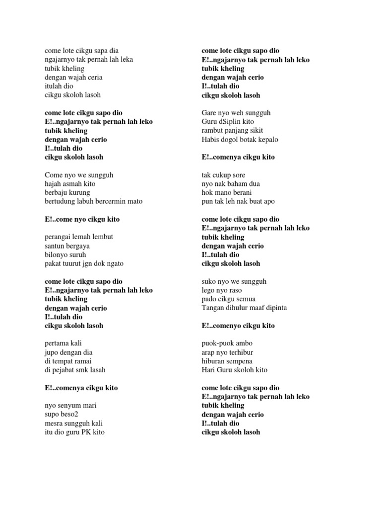 Lirik Lagu Kami Guru Malaysia Kami guru Malaysia Berikrar dan berjanji Mendidik dan memimpin Putra putri negara kita Pada Seri Paduka Kami tumpahkan setia Rukun Negara kita Panduan hidup kami semua Di bidang pembangunan Kami tetap bersama Membantu membina Negara yang tercinta Amanah yang diberi Kami tak persiakan Apa yang kami janji. Tas hitam dari kulit buaya Selamat pagi berkata bapak Oemar Bakrie Ini hari saya rasa kopi nikmat sekali Tas hitam dari kulit buaya Mari kita pergi memberi pelajaran ilmu pasti Itu murid bengalmu mungkin sudah menunggu Laju sepeda kumbang di jalan berlubang Slalu begitu dari dulu waktu jaman Jepang. Guru merupakan tunjang terpenting dalam sistem pendidikan negara.